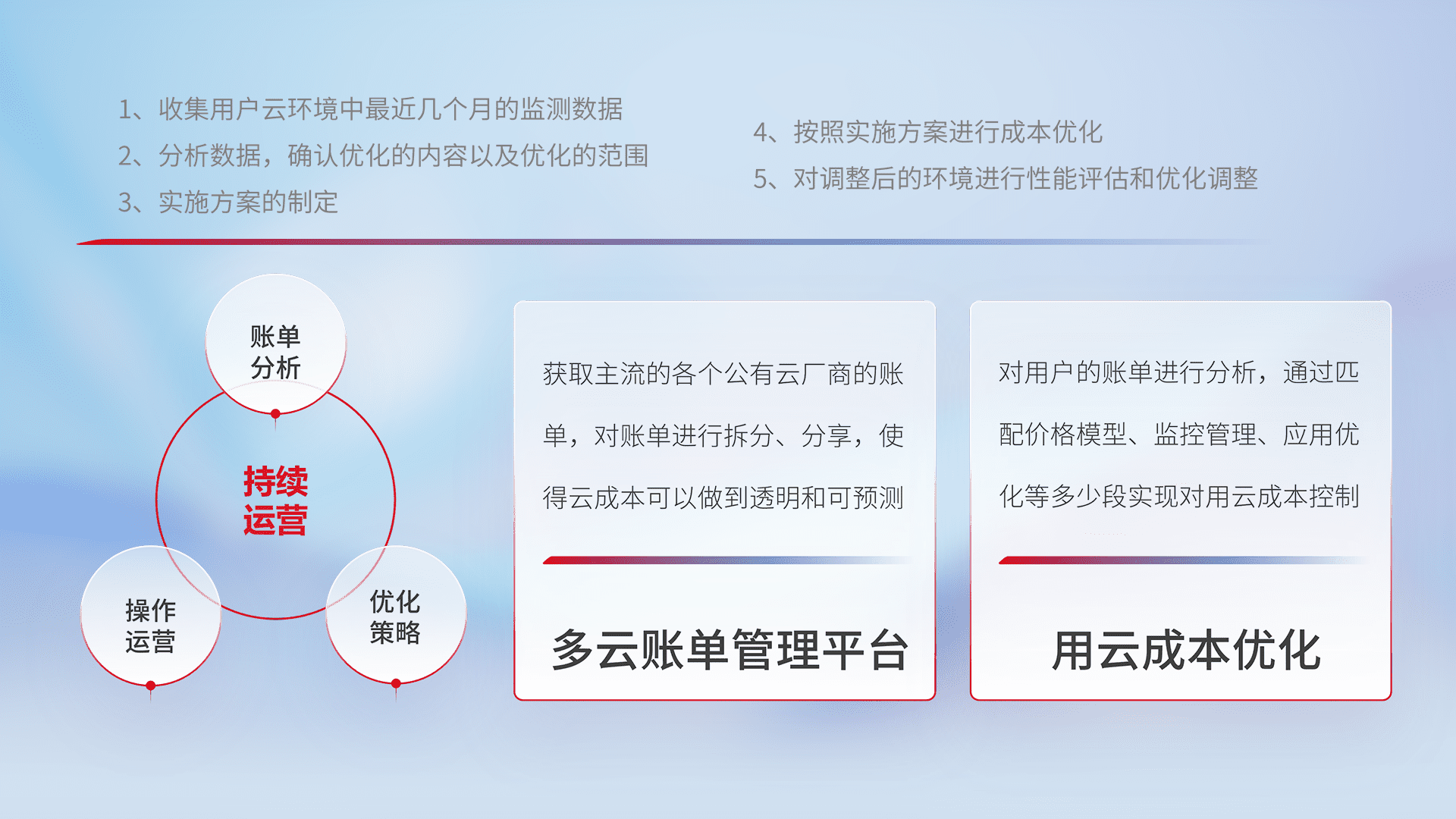 通过灵活运用多种自动化迁移工具,,,,帮助企业用户实现业务和数据高效 、、稳定的上云迁移和云上迁移,,采用自研多云纳管平台,,,,以中立管理模式,,解决多组织、、、、多云、、、多运维厂商的复杂关系的管理,,保证多云平台资源配置的一致性,,,实时掌控云资源运行数据,,运用智能化工具分析云资源多云平台的管理服务,,,透明化管理成本支出,,,,用云成本可预测、、、用云费用可优化、、、云资源配额有据可依。。