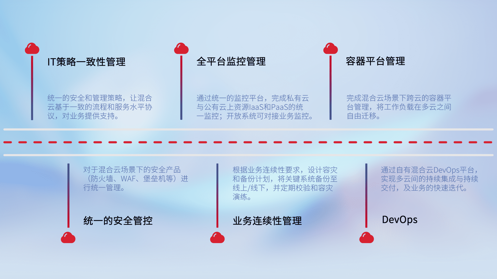 通过多云纳管,,,,以统一的资源数据模型把客户的云资源进行抽象和封装,,,,进而实现对多云资源的统一操作,,,,保障云资源管理的可靠性、、、稳定性与可用性。。。。量身定制化运维内容,,配置、、开发运维、、、补丁管理、、备份、、、监控、、、、认证和访问管理、、审计和日常巡检等,,,,保障在用云过程中的可靠度,,,稳定度以及高可用率。。